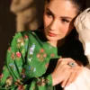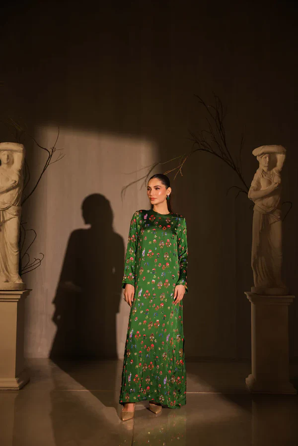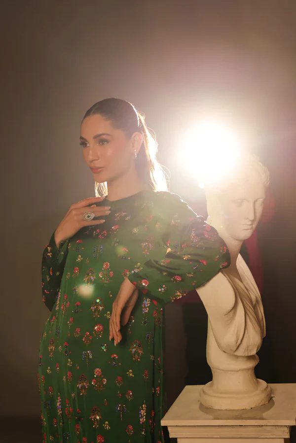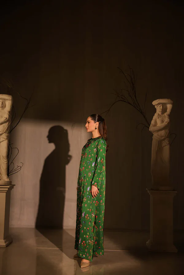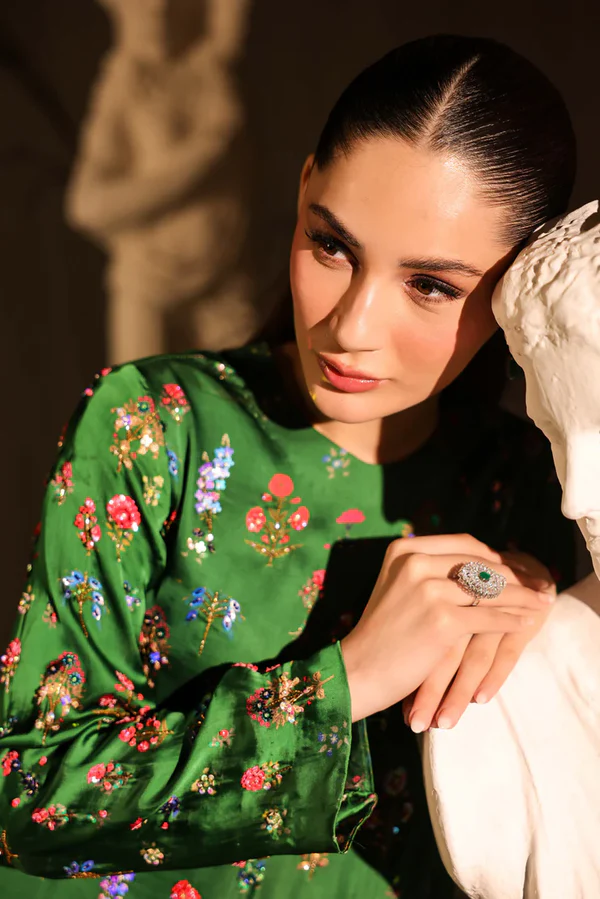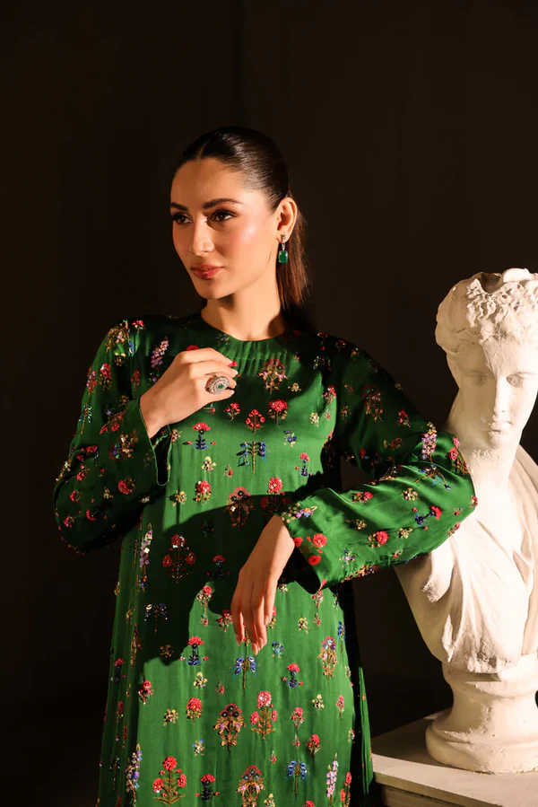 Korean digital print charmeuse long maxi style shirt full of intricate hand embellishments all over the front and sleeves. Sequins, cut daana, beads, crystals and rhinestones. Paired with same korean charmeuse digital print capri pants.
