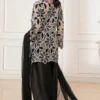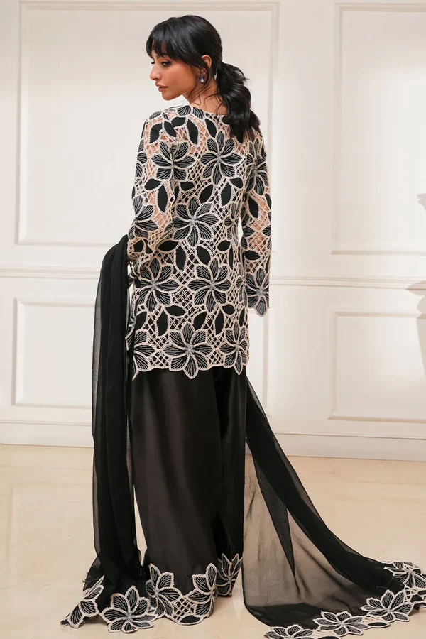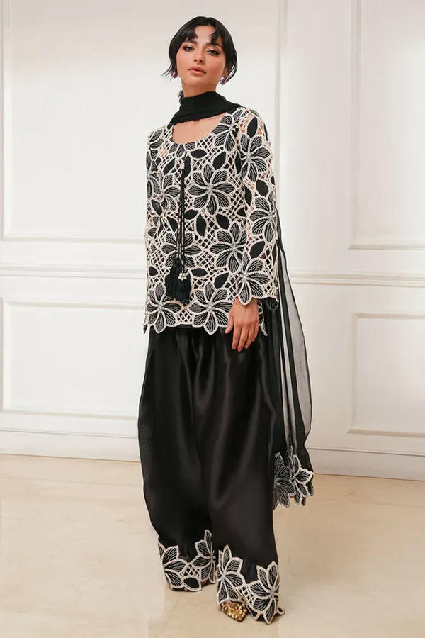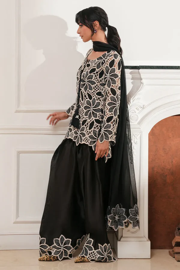 All-over cutwork appliqué detailing across the shirt and farshi shalwar, paired with a butter silk chiffon dupatta finished with delicate appliqué cutwork.