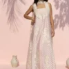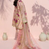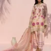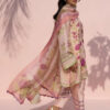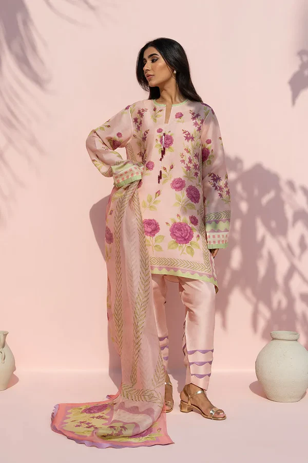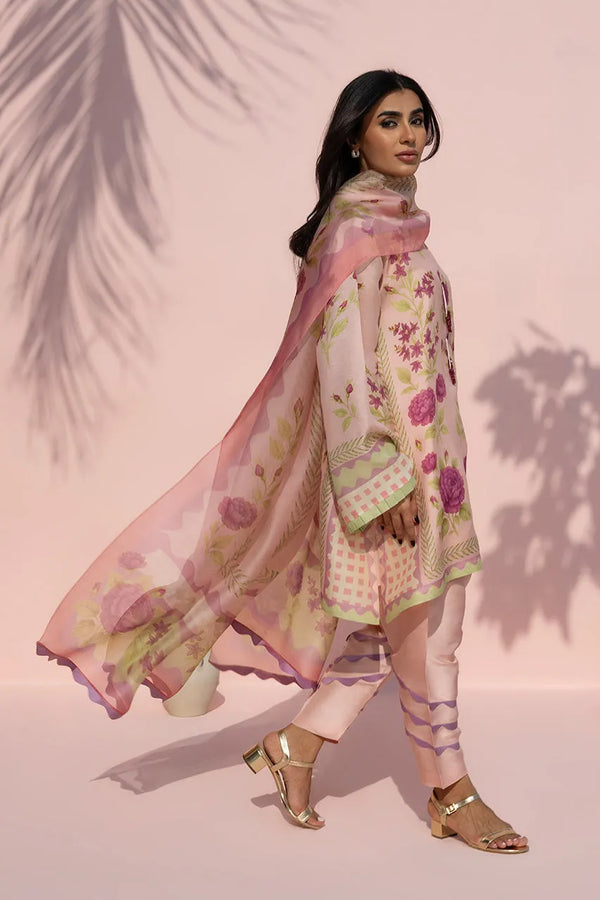 A soft blush ensemble brought to life with delicate floral prints and gentle tea green contrasts. The relaxed khaddi silk shirt features painterly rose motifs in mauve and sage, framed by patterned borders along the hem, cuffs, and neckline. Paired with a matching tapered shalwar detailed with scalloped accents at the ankle, the look is completed with a coordinated organza dupatta finished with leafy stripes and soft geometric edging, adding fluidity and romance.