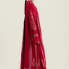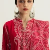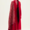 A signature red five-paneled kurta adorned with intricate Kashmiri embroidery on the front and back, showcasing fine craftsmanship and detail. Paired with a heavily embroidered red marina shawl featuring a pop of cobalt blue and matching tonal trousers, this ensemble reflects warmth, heritage, and timeless elegance.
