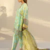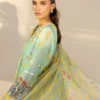 In a luminous medley of citron frost and seafoam, this ethereal cotton net shirt is adorned with intricate gota and zardoze work on a painterly floral print, exuding a whimsical charm. Paired with matching khaddi silk shalwar featuring sprinkles of embellishment. A diaphanous organza dupatta basking in a soft citrus hued print and gota details, celebrates contemporary finesse.