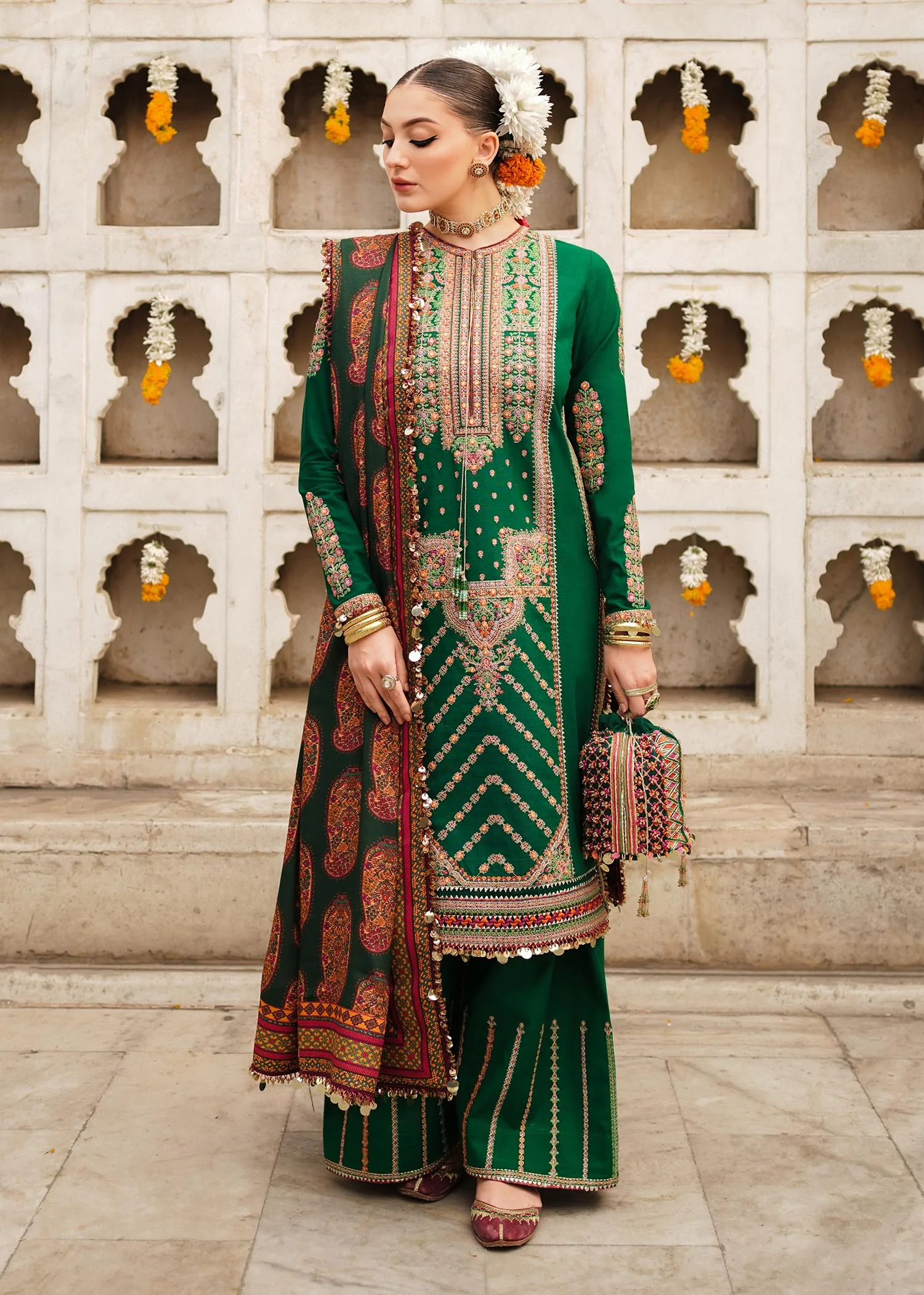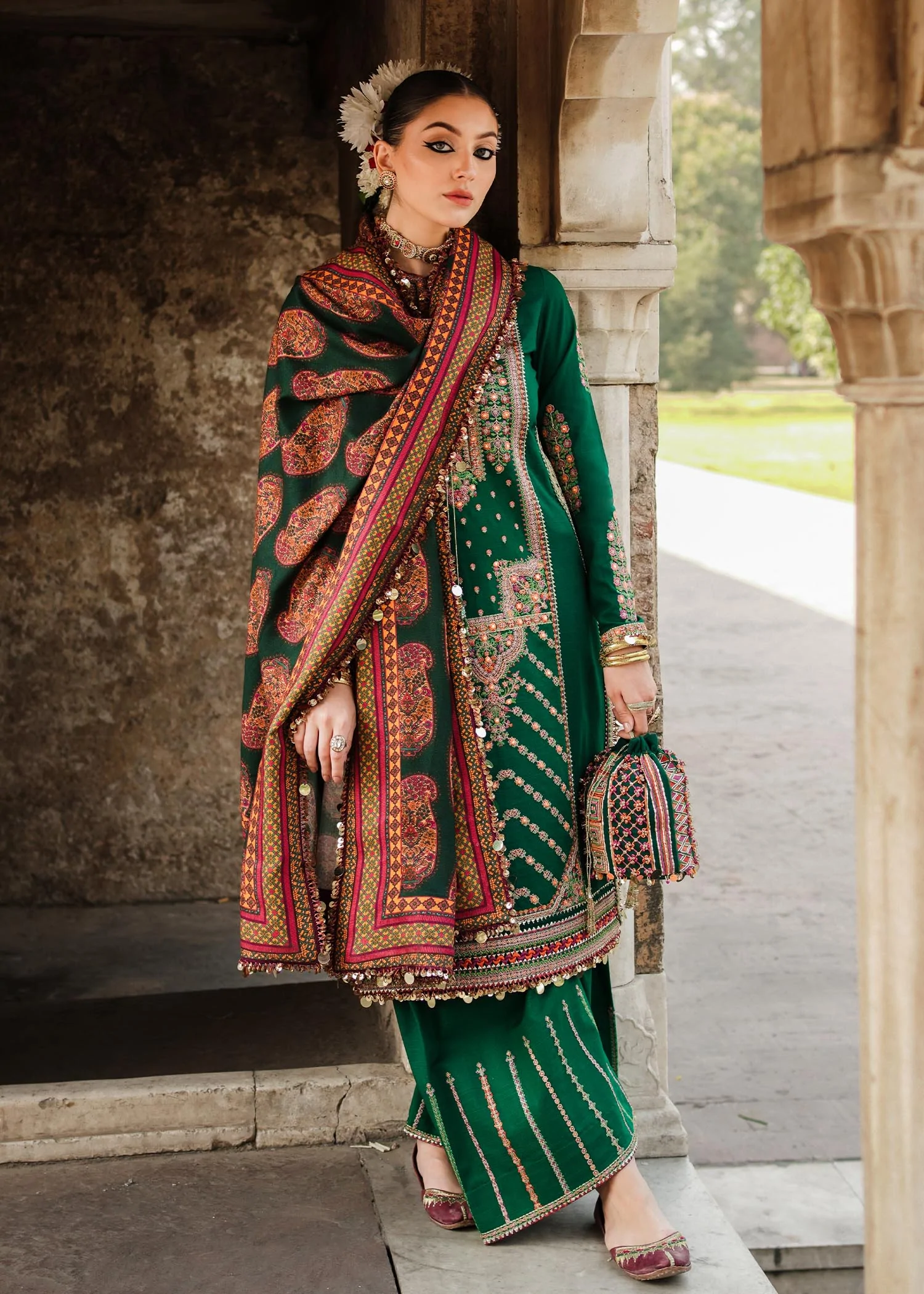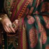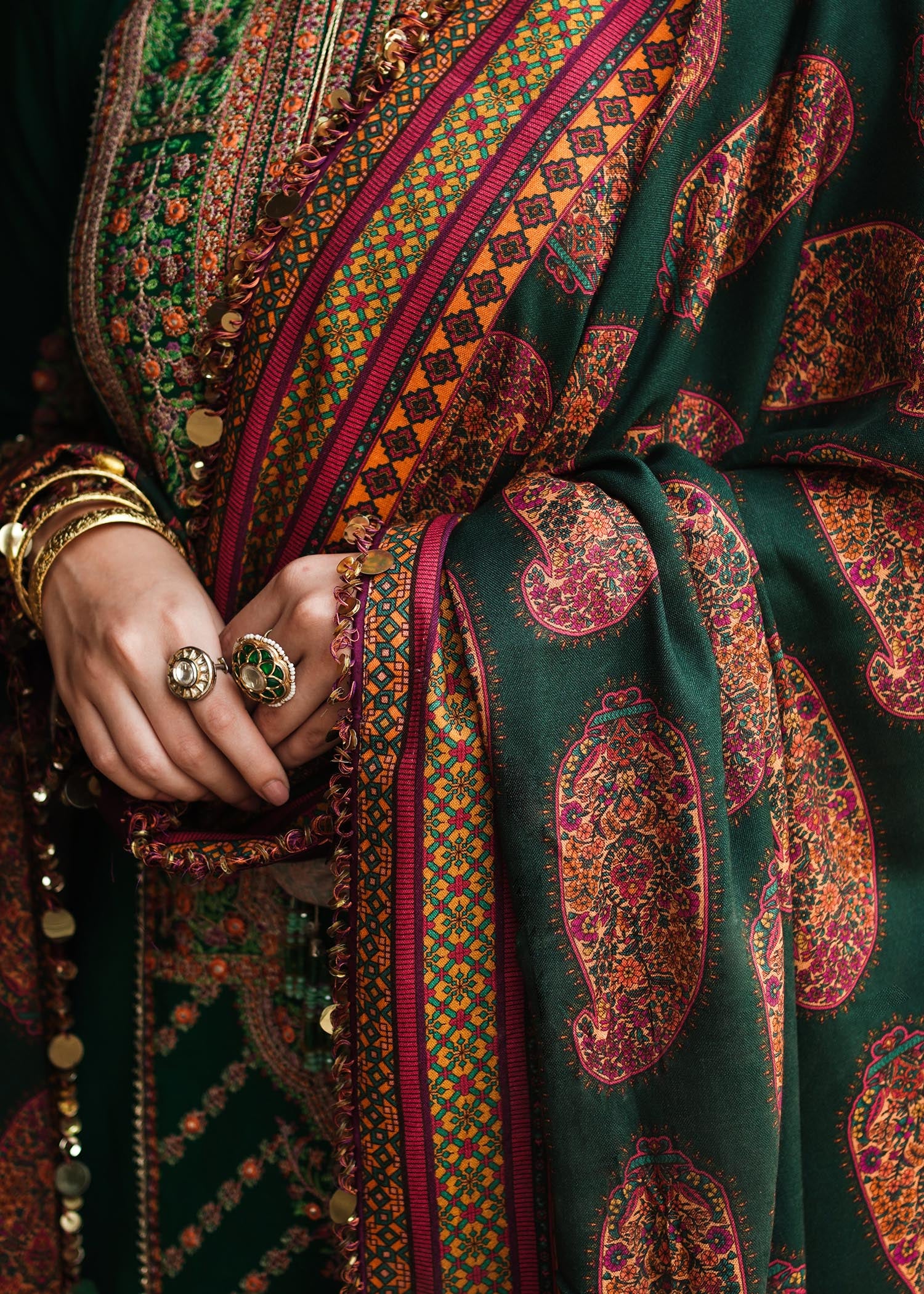 Lamisa – an enchanting dark green design made on khaddar, embroidered with magenta, orange, green and rust tribal floral motifs. Paired with embroidered trousers and printed woolen shawl.