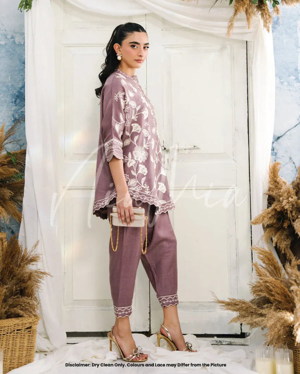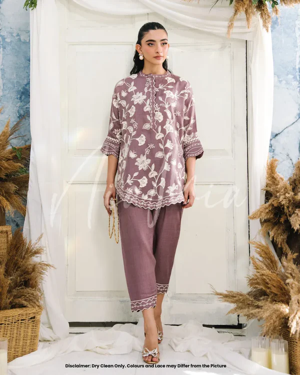 Lavender Glaze is a two-piece embroidered set crafted in soft pashmina, designed for understated winter elegance. The NM-cut shirt is adorned with delicate tonal embroidery that flows seamlessly across the front and sleeves, creating a refined yet relaxed silhouette. Paired with a narrow shalwar, this look feels polished while remaining effortless.