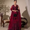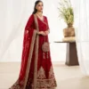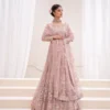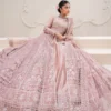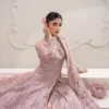 Radiating grandeur, Leyan makes a sublime statement. Rendered on dusty pink net, the shirt and lehenga set is lavishly adorned with intricately patterned embroideries, adding a touch of finesse. The ensemble is further elevated with a diaphanous net dupatta that creates an effortlessly graceful profile, evoking modern femininity with a whisper of timeless charm.