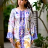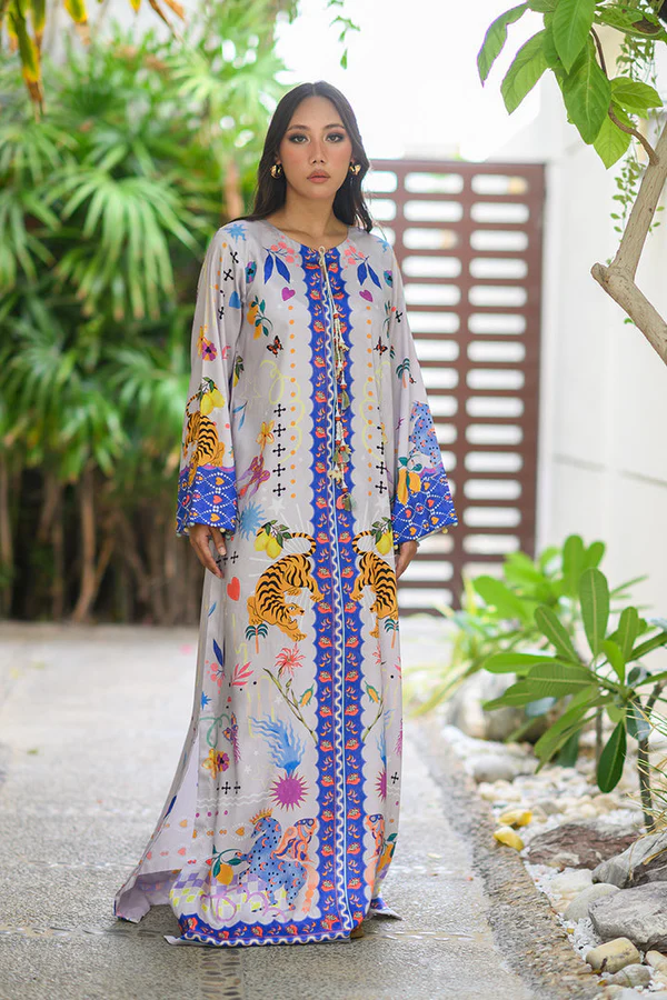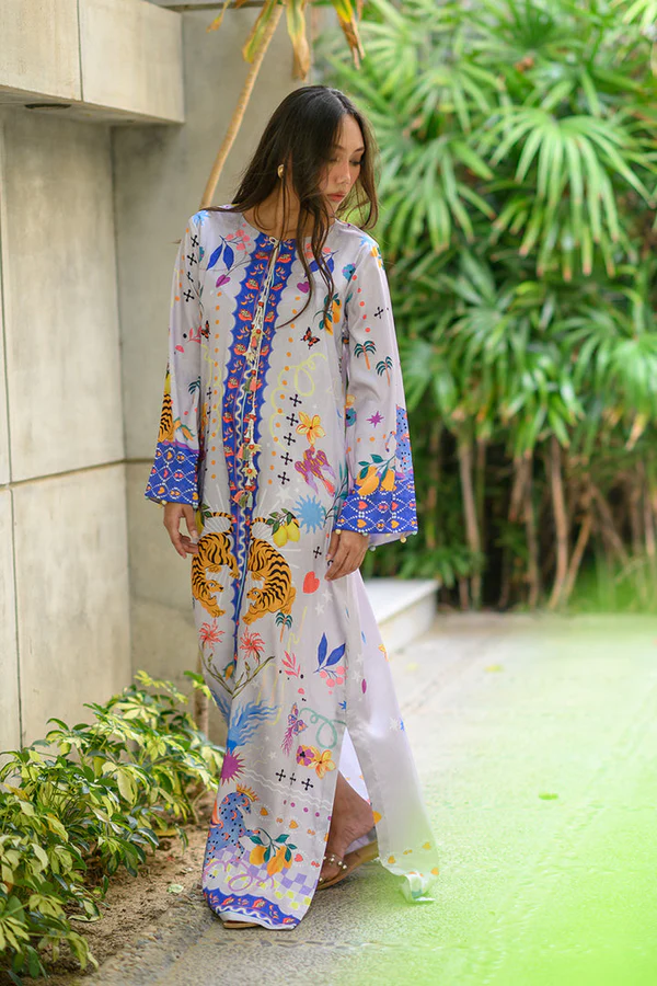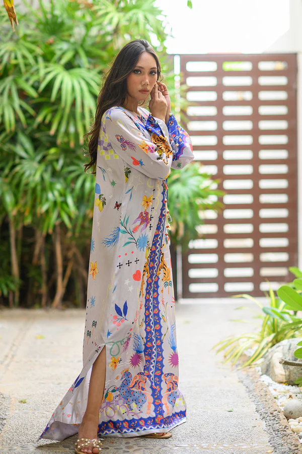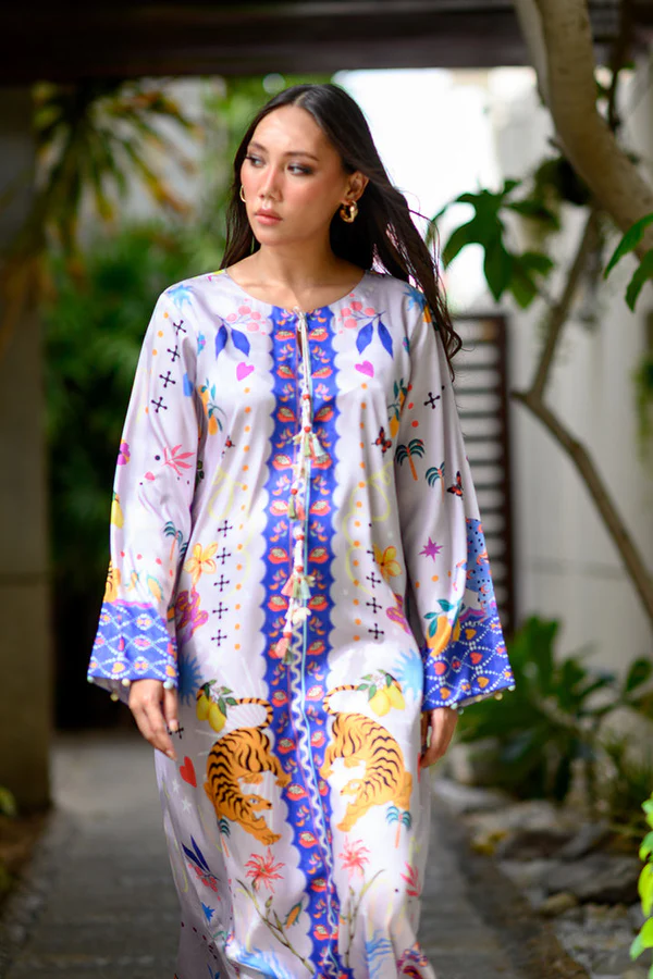 A celebration of colour and creativity, this digitally printed kaftaan brings whimsical energy to a classic silhouette. Featuring jungle animals, butterflies, florals and eclectic geometric elements on a soft lilac base, Lilac Majesty turns heads and tells a story. The relaxed fit flows effortlessly – great for days when you want comfort with a side of statement!