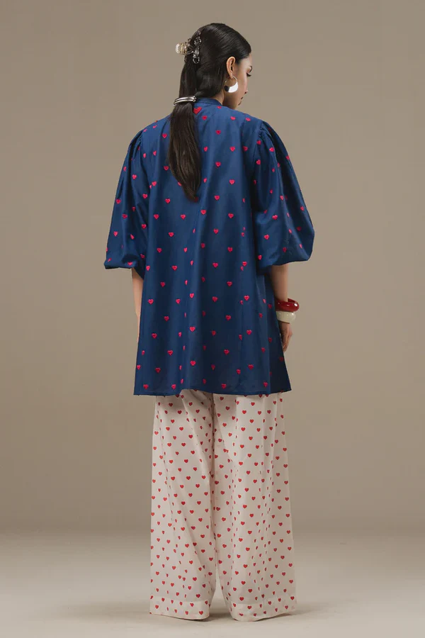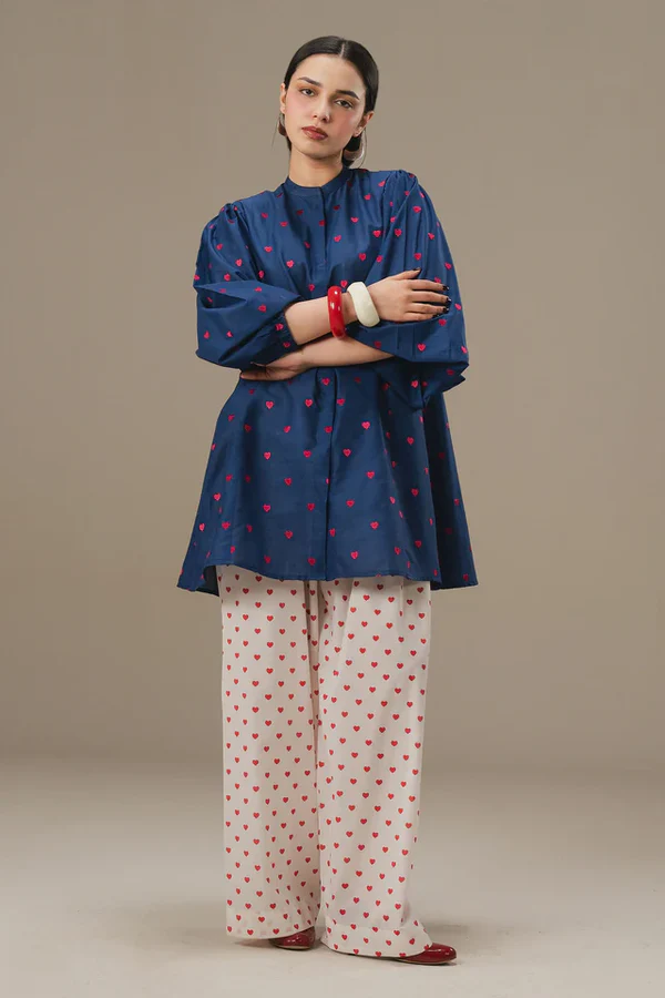 A blue paneled cambric kurta with delicate heart embroidery, paired with a matching heart-printed cambric shalwar. Playful details and a relaxed silhouette make this set effortlessly charming for everyday wear.