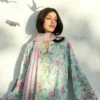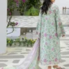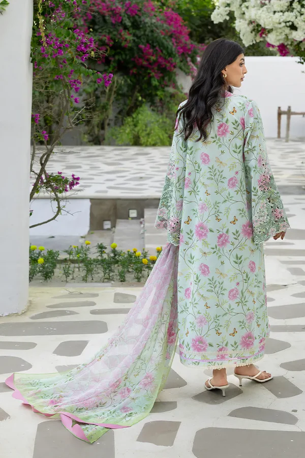 Fresh and delicate in mood, a subdued aqua jacquard lawn shirt features a finely arranged floral print in pink and soft sage tones. Floral embroidery highlights the neckline, complemented by eyelet and scalloped detailing along the sleeves. The ensemble is paired with printed jacquard lawn culottes in matching tones, finished with scalloped floral embroidery at the hem. A matching chiffon dupatta completes the look with a coordinated floral composition, framed with a contrasting border.