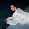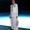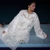 This distinctive outfit features an elegnat ivory silk shirt features delicate organza machine embroidery with hydrengia cutworl for a soft, graceful look. The neckline is finished with gold coin and white sequen tussels, adding a hint of shine. Paired with plain ivory silk trousers accented by an organza patch, the outfit blends simple sophistication with style.