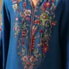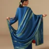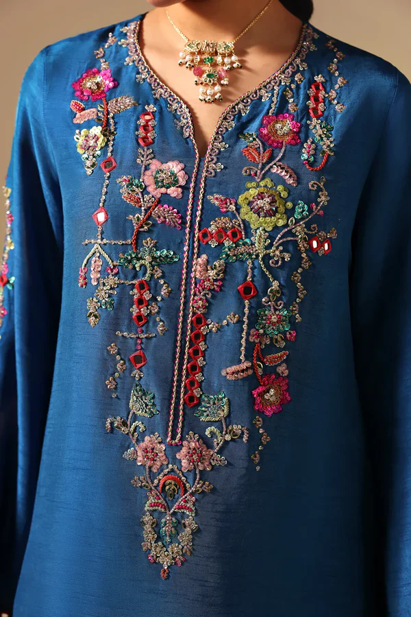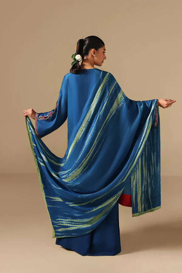 A refined blue three-piece ensemble features a hand-embellished shirt with floral motifs created from sequins, beads, crystals, and thread-work. The design includes a detailed neckline and elongated slit sleeves finished with embroidered borders. The shirt is paired with wide-leg pants and a dupatta that features a handmade tie-dye effect with contrasting borders that completes the ensemble with refined charm, making it ideal for Eid celebrations.