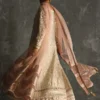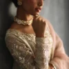 Whats more timeless than a celestial ivory meysuri peshwaas rendered with delicate zardozi embroidery over a block printed base! ‘Mahbano’ is accentuated with a finely crafted neckline and statement borders that are an amalgamation of laces and embroidery. The show stopping net sleeves add an additional dimension completing the outstanding look!