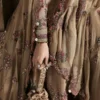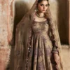 Beige pishwas is a regal creation, composed with Korean raw silk embroidered floral bunches with embroidered borders while the maroon pink Korean raw silk churidar balances the look with bold contrast. The chiffon dupatta with embroidered floral bunches adds richness. This attire blends elegance with grandeur, making it an ideal choice for weddings
