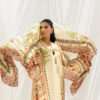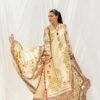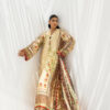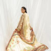 Rendered in warm almond beige chevron on a cream canvas, this ensemble blends tradition with a contemporary edge. The cotton net shirt features symmetrical botanical vines and geometric patterns in earthy olive, rust, and deep brick red. Delicate floral bunches and scalloped 3D borders enrich the hem and sleeves, while the flowing medium silk dupatta echoes the motif story through floral grids, trailing vines, and classic borders in complementary tones, forming a rich visual tapestry. Finished with pure raw silk tapered trousers detailed at the hem.