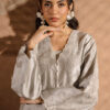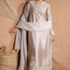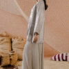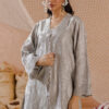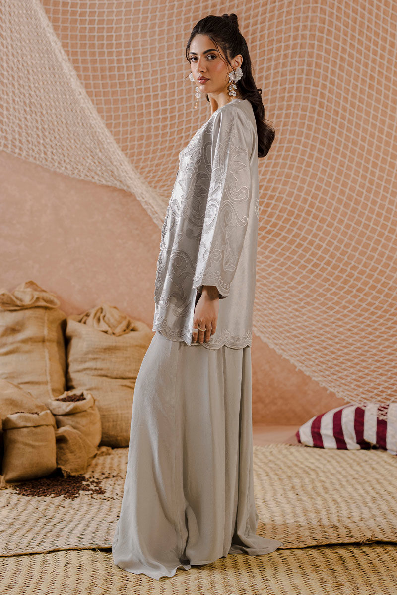 A loose-fit steel grey sheesha silk jacket with tonal embroidery and khaddi silk appliqué for subtle textural contrast. The set is paired with crepe palazzo pants, completing a fluid and modern silhouette.