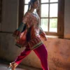 This vibrant A-line short shirt in a multicolored block print is a celebration of artisanal elegance. The velvet neckline brings a touch of luxury, beautifully adorned with resham work and hand embellishments of gold dabka, nakshi, pearls, and colored sequins. Exaggerated sleeves feature hand block-printed borders enriched with gota, finished with velvet trim and delicate gota detailing. Paired with a hot pink silk shalwar complete with gota finishes, this ensemble effortlessly blends traditional artistry with a bold, contemporary flare.
