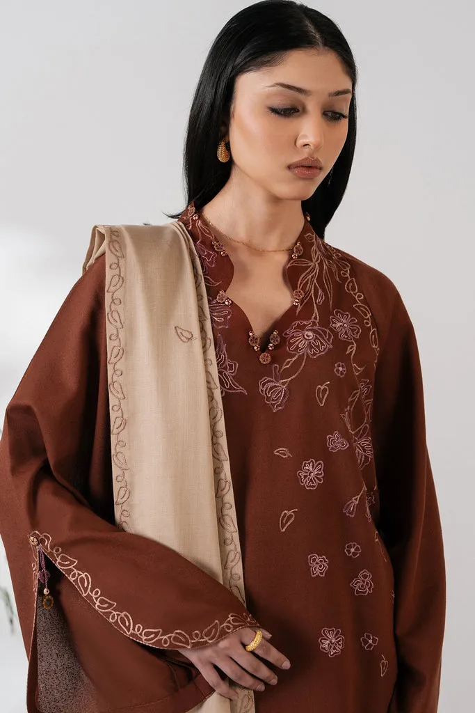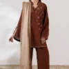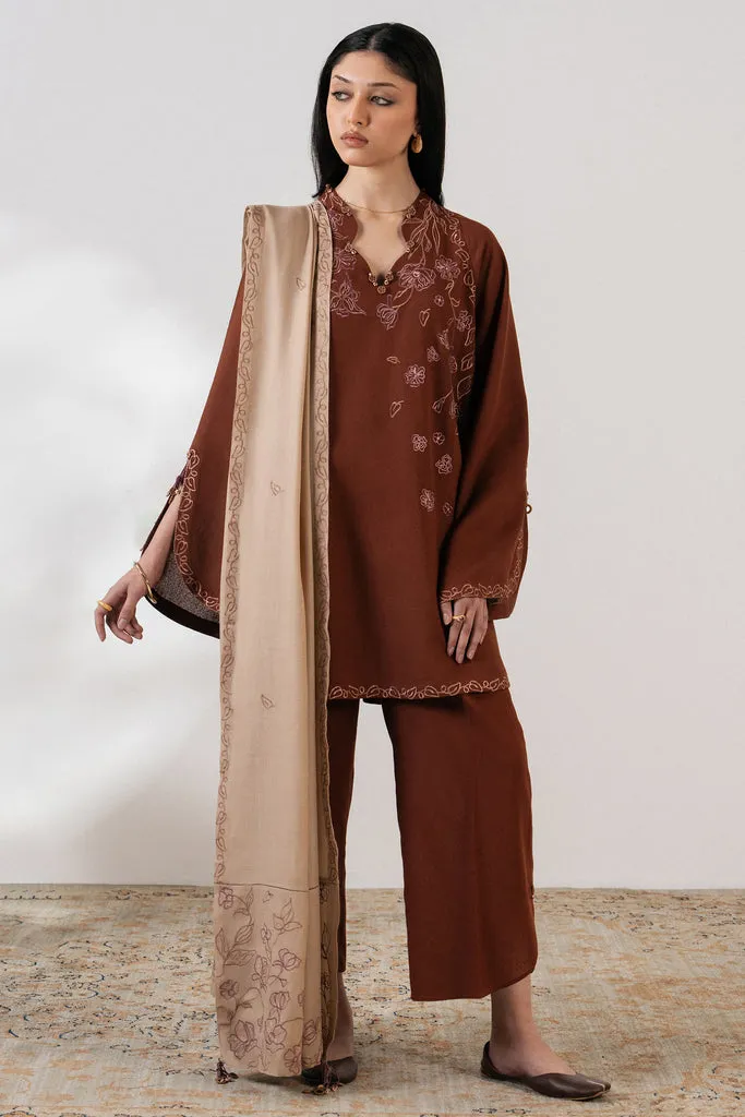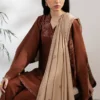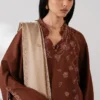 MEHR — Rust-brown two-piece with delicate tonal floral embroidery, relaxed wide-leg trousers, and a soft beige dupatta with ornate border. Minimal, warm, effortlessly refined.