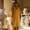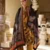 Stay warm and stylish in this three – piece mustard khaddar outfit, featuring elegant black embroidery on a shirt and sleeves, lace on V_ Neck Delicate embroidery on the back of the shirt. Its Paired with a delicately embroidered standout culottes, paired with black printed shawl, this look blends comfort with effortless charm. Perfect for elevating your everyday style in this winters.