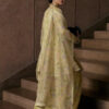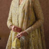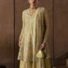 - A butter yellow organza peplum with V-neckline, front open design, all-over embroidery, fitted sleeves with embroidered borders, and lilac, rose gold, and mint accents with mirror work and embellishments.