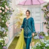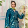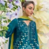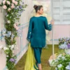 A rich statement piece from Zarayna Festive formals. A stunning ensemble featuring a pure sheesha silk short shirt and skinny shalwar in a rich teal green, paired with a contrasting lime green pure sheesha organza dupatta. Intricately adorned with leather and stone work in moon motifs, the outfit is elevated by cutwork detailing on the daman for a refined finish. The heavily embellished dupatta showcases a bold zigzag pattern, adding a striking, festive touch.