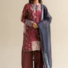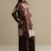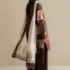 A mocha-toned shirt and trouser set, paired with a fluid silk dupatta—earthy, refined, and easy to love.