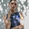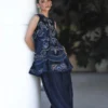 When regal meets contemporary, you get ‘Midnight, a sculpted peplum embroidered in ivory and contrast blue florals and further elevated with mirror work on the neckline. The ensemble allows its crisp tailoring and bold geometry to speak with quiet confidence. Flowing farshi shalwar in silk creates a statesque grace and completes the look with vinatage charm.