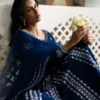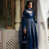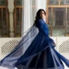 This elegant navy blue pishwas is intricately embroidered in graceful hues of blue and ivory, creating a refined and timeless appeal. The bodice is adorned with silver naqshi, bugle beads, and sequins, adding a subtle shimmer that elevates the overall design. Paired with a statement chooridar pajama for a classic silhouette, the look is completed with an organza dupatta featuring delicately embroidered scalloped borders. Perfect for weddings, festive gatherings, and formal celebrations, this ensemble embodies sophistication with a touch of traditional charm.