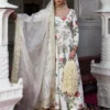 An Ivory Korean raw silk peshwaz, richly embroidered in Gara florals, ornate lappa and gotta detailing at the hem, and luminous silver sequin accents. Paired with a stunning organza dupatta, featuring bold Gara embroidery borders adorned with vibrant red rose motifs, and finished with delicate gotta trimmings. Complemented by a sleek Chanderi silk churidar, this ensemble exudes understated elegance.