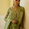 This pear green angrhaka style kurta is a vibrant and elegant piece, perfect for any festive occasion. It features intricate resham embroidery that adds a touch of sophistication and artistry to the outfit. The kurta is complemented by a beautifully embroidered dupatta, which enhances its overall charm, and stylish culottes pants that provide comfort and a modern twist. This ensemble combines traditional aesthetics with contemporary flair, making it an ideal choice for celebrations or gatherings.