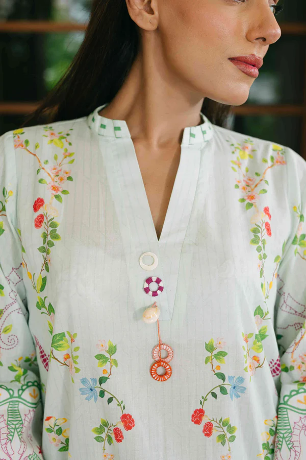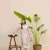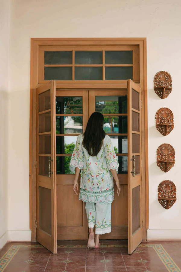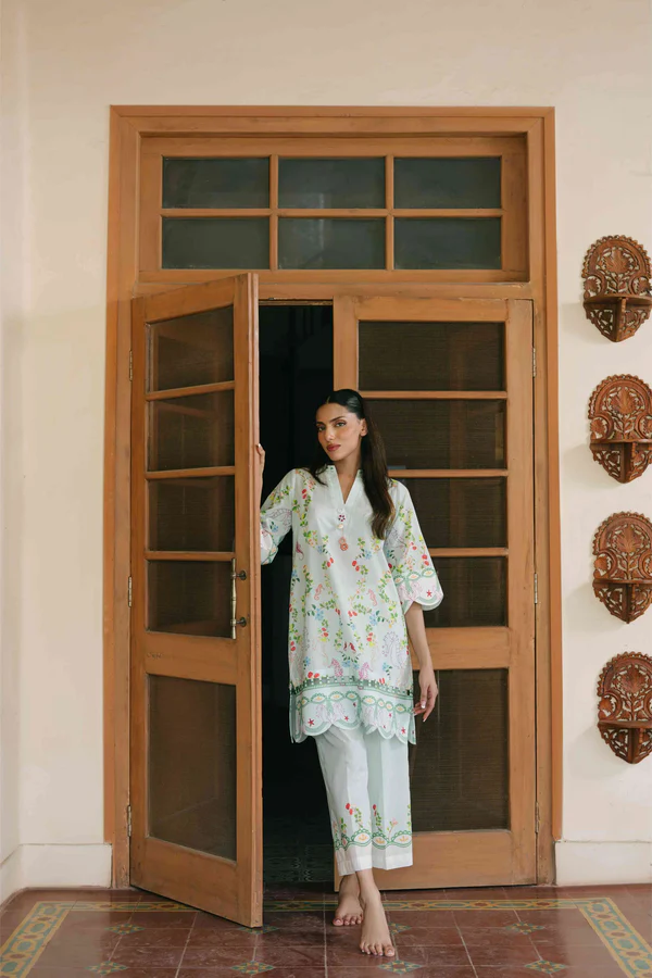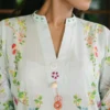 A breezy ensemble delicately adorned with soft, playful florals for a fresh seasonal feel.