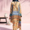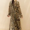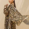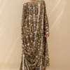 Exuding glamour, this floor-length shirt is crafted from rich, deep olive green and ebony-hued cotton net. The sheer fabric is overlaid with an olive and butter yellow leaf print, elevated by stripes of shimmering gold sequins. The silhouette features masterful draping, paired with a matching pre-draped cotton net dupatta embellished with gold sequins. Defined by its dynamic print and glittering sequin details, the look is completed with a matching pure rawsilk tube top and printed khaddi silk culottes with sequin-accented hems.