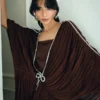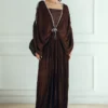 Minzy georgette chiffon kaftan is designed with diamond-worked necklines on the front, back, and sleeves, finished with 3D bow brooch accents on both sides.