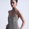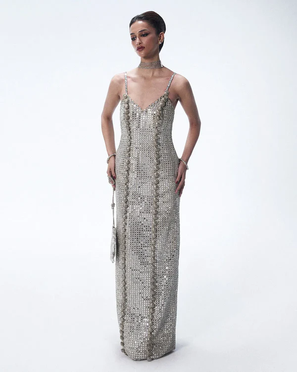 A long net dress featuring a modern silhouette, fully embellished with mirrorwork and metal handwork arranged in a repetitive pattern. The look is elevated with intricate custom silver buttons adorning the two front panels, creating a regal and sophisticated finish.