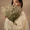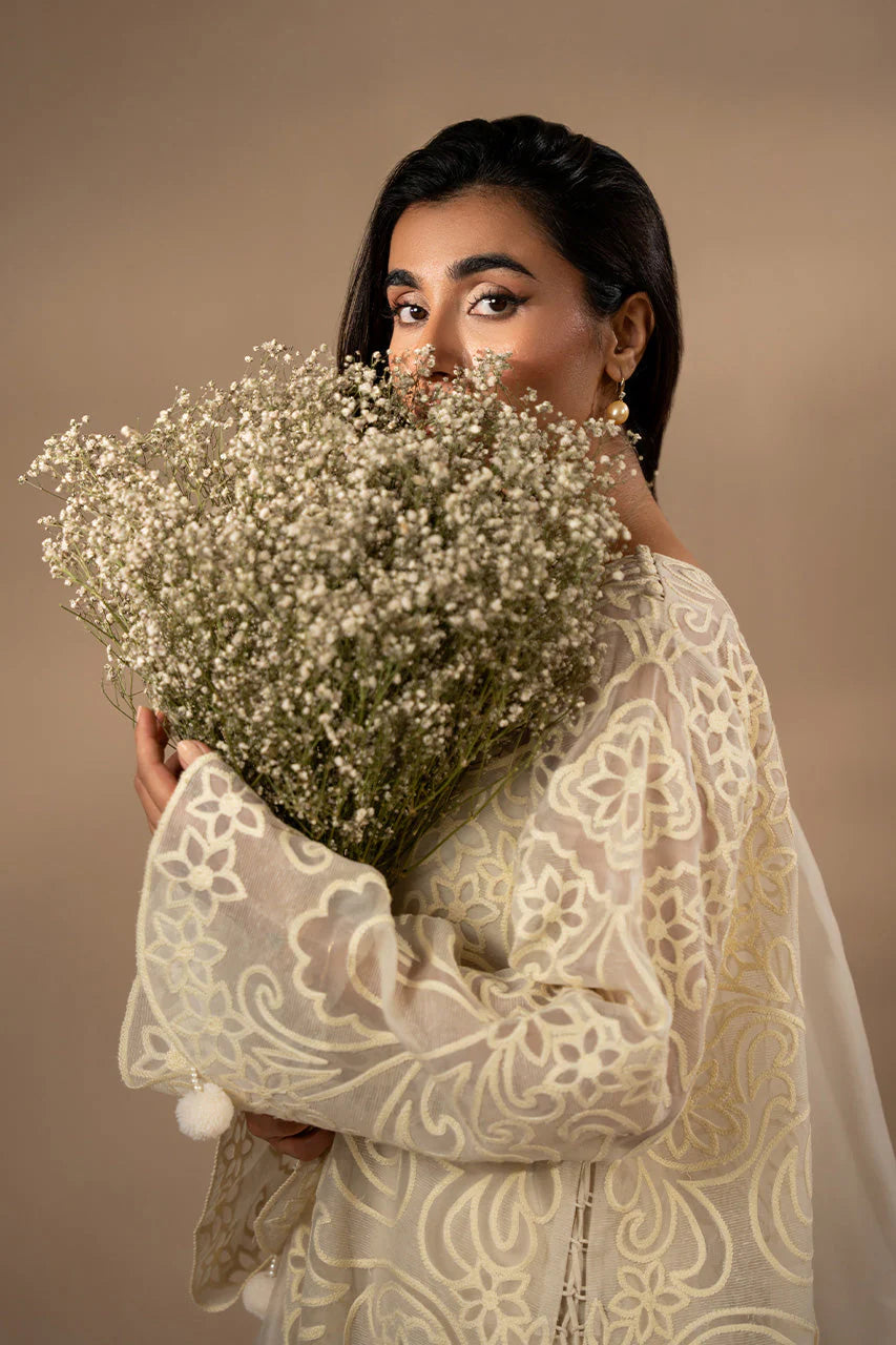 A sublime creation in ivory, this khaddi corduroy A-line shirt is adorned with flowing botanical aari embroidery that appears seamlessly woven into the fabric. Flared sleeves with scalloped borders and pompom accents add a delicate flourish, complemented by a cutwork hemline. The neckline and sides are finished with crisscross dori and playful tassels. Paired with a cascading organza dupatta featuring cutwork edging for an artisanal touch, and khaddi silk flared pants with intricately scalloped hems and tailored side pockets.