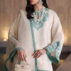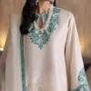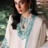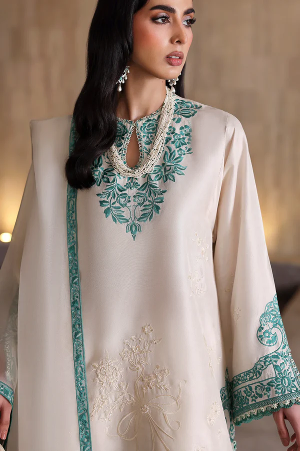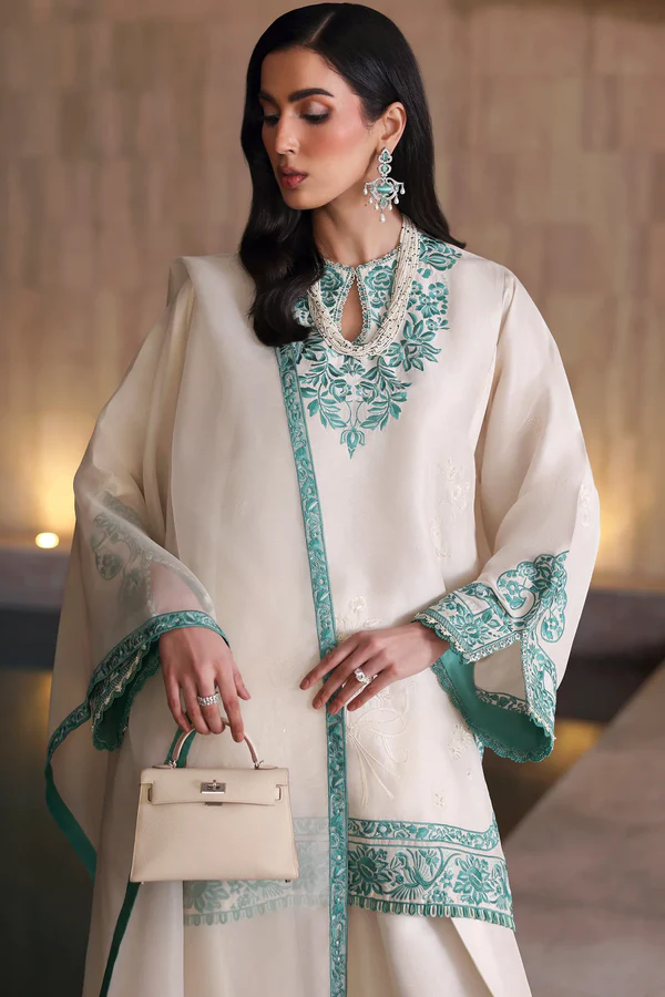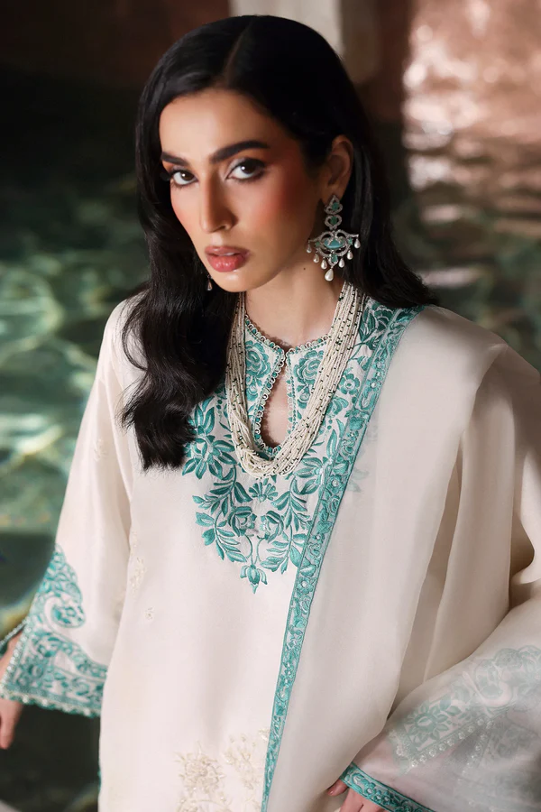 The shirt is paired with a flowing farshi shalwar, delicately adorned with subtle floral embroideries that add understated charm to the silhouette. A sheer pure organza dupatta with embroidered borders completes the ensemble, bringing lightness and movement to the look.