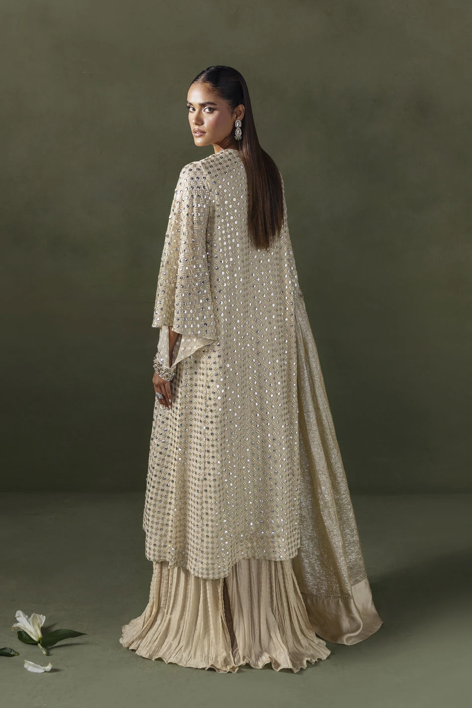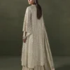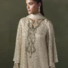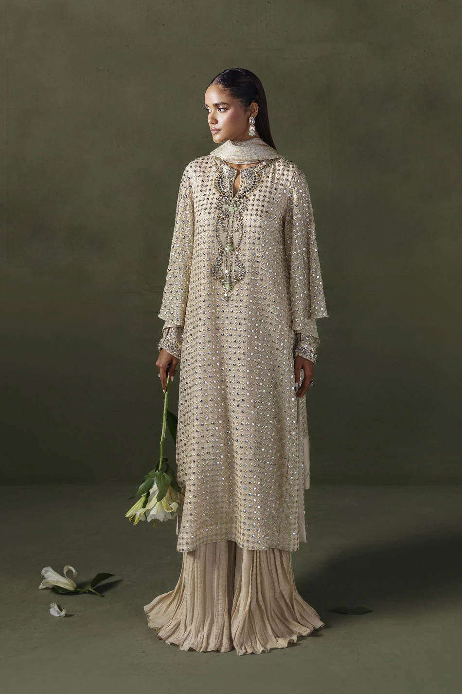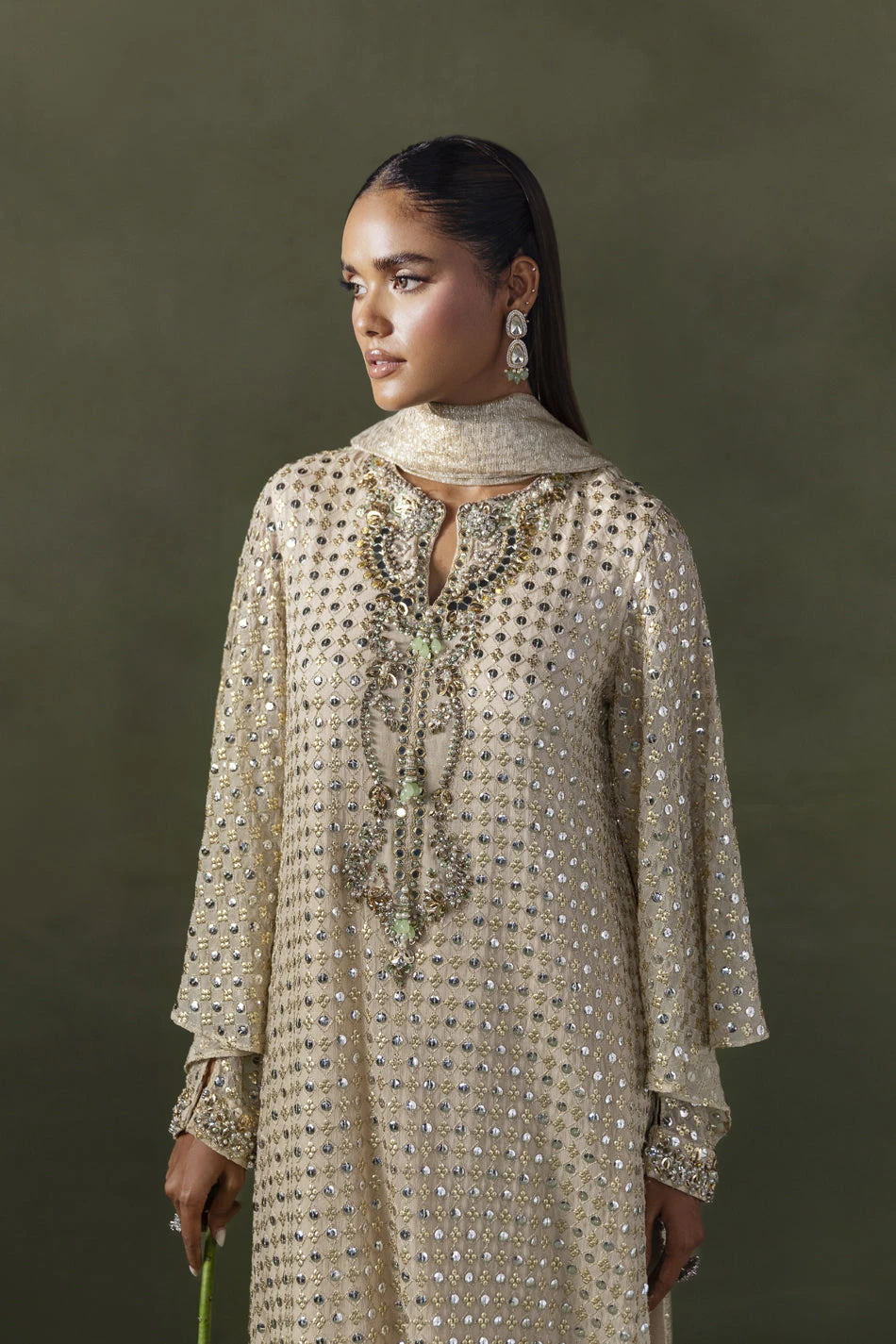 This ivory 3-piece luxury formal captures sophistication with its intricate details and elegant silhouette. The shirt features an all-over sequined pattern, beautifully accentuated by our laboriously crafted bead-work. The neckline is adorned with pearl, resham, and mirror work that further enhances its charm while statement sleeves with embellished cuffs lend a contemporary touch. The ensemble is put together with a beautiful shimmering dupatta and crushed pants, adding radiance to your festivities.