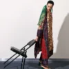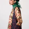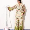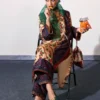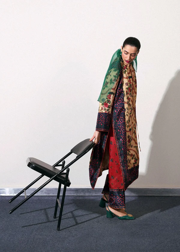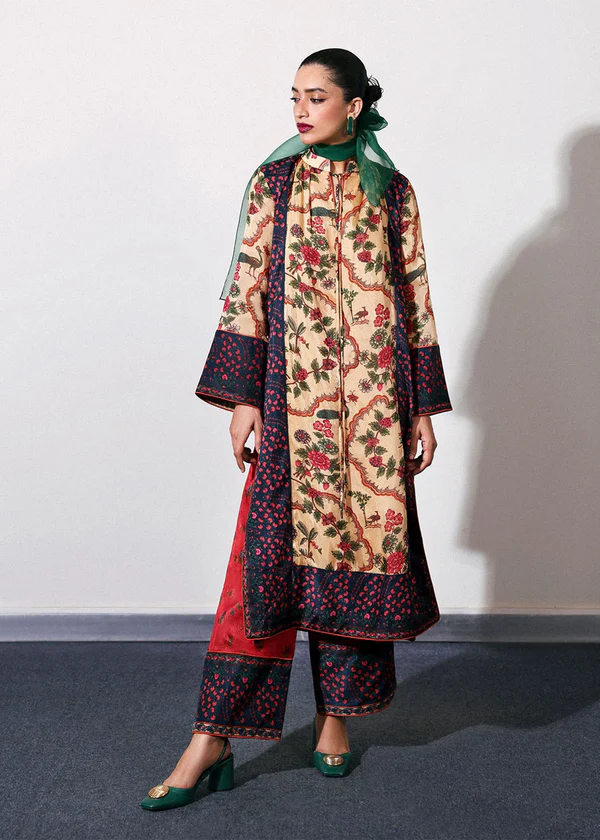A light camel floral printed long shirt framed with blue floral borders on all sides, featuring a gathered neckline and printed silk tassel. Paired with straight, ankle-length red pants finished with blue border detailing.