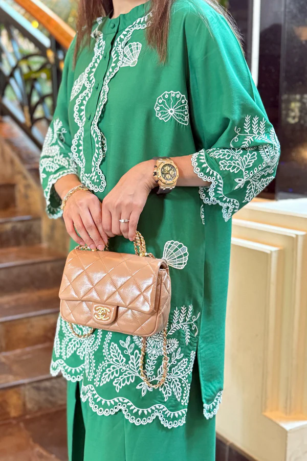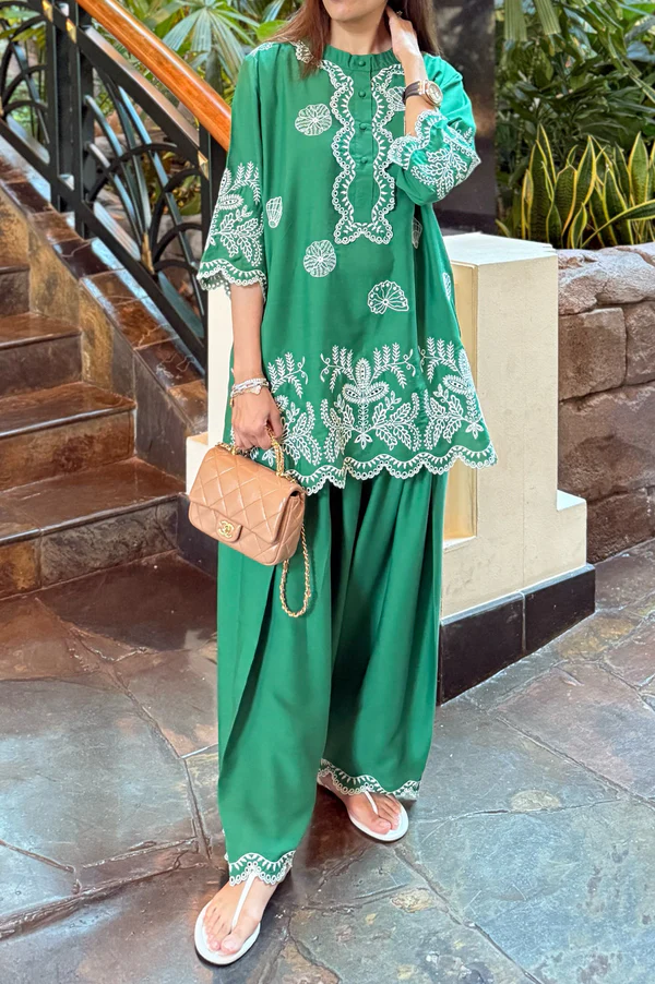 Features a fully embroidered in-house shirt, beautifully paired with an embroidered farshi shalwar.