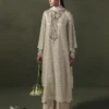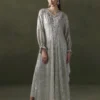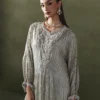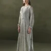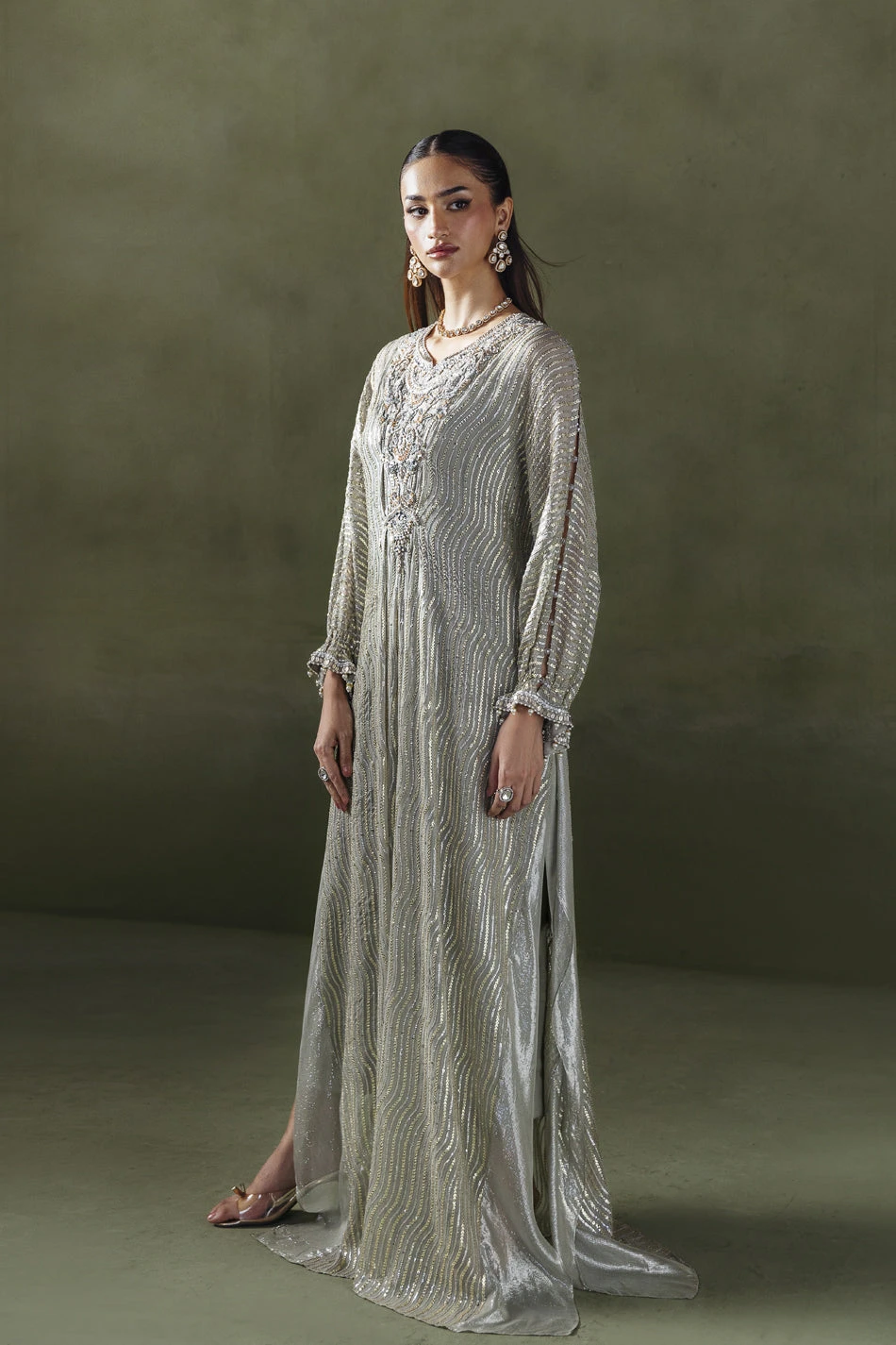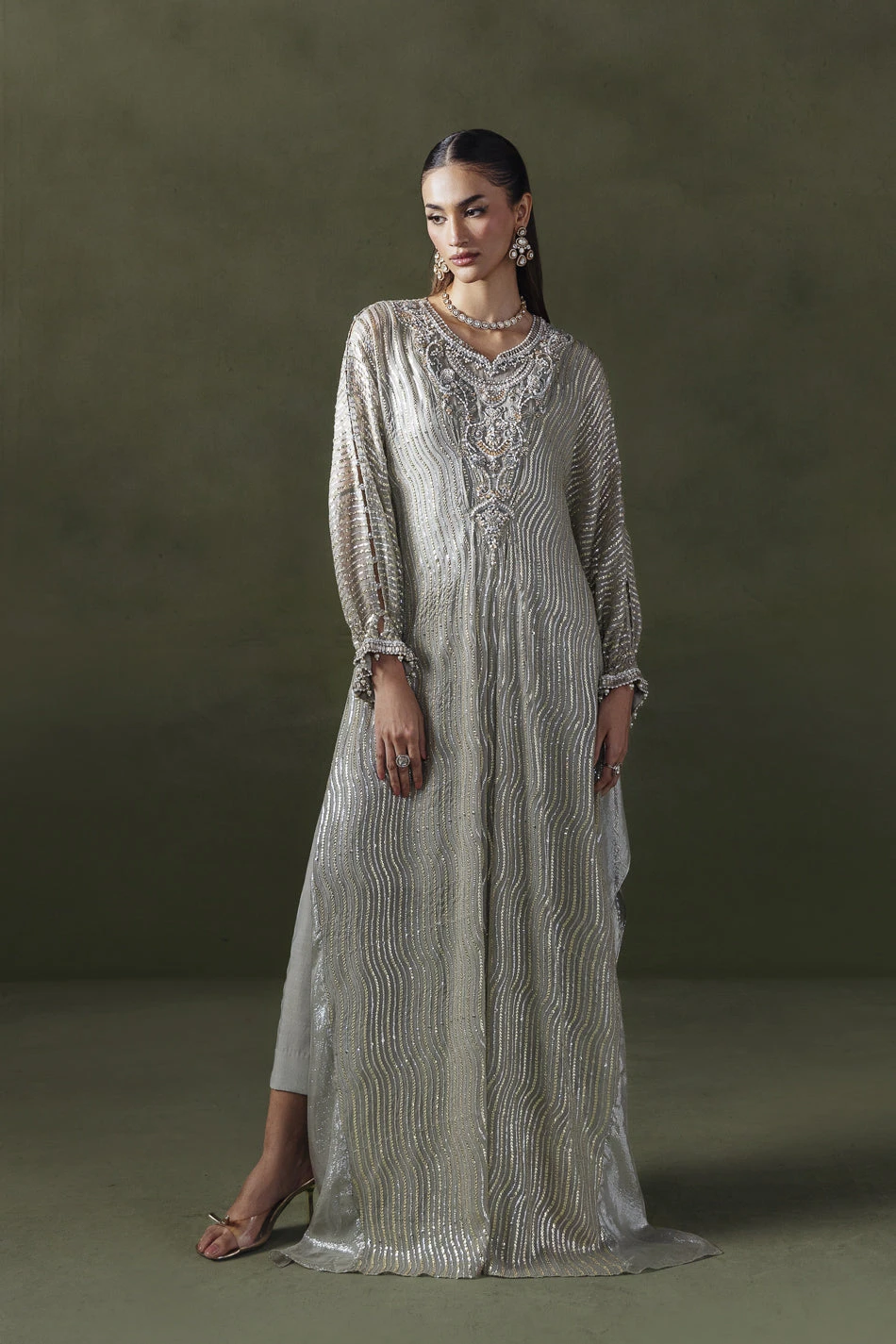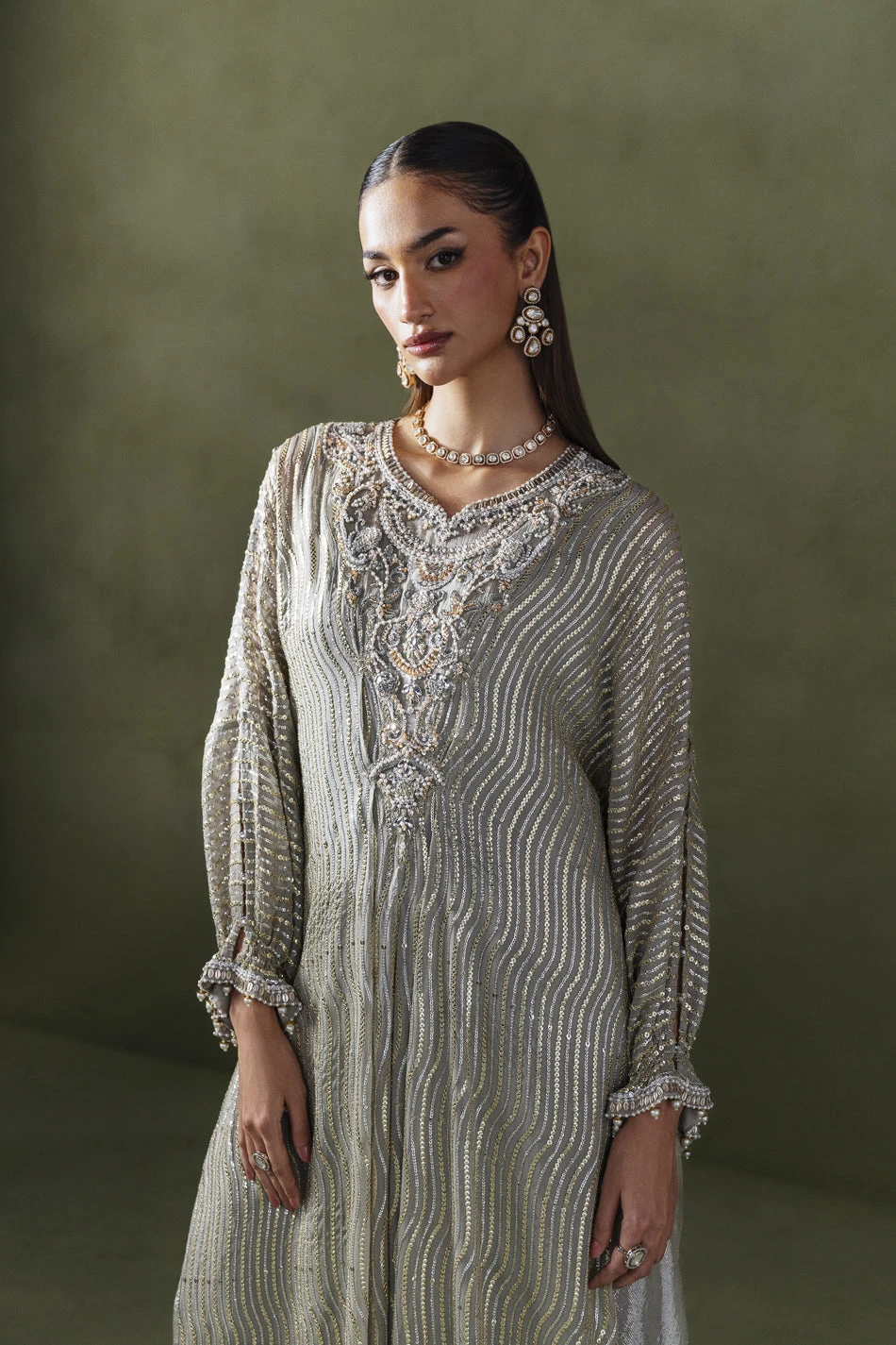A graceful long silhouette in a soft grey-beige tone, adorned with delicate linear sequin work. The neckline features intricate embroidery with crystals, sequins, and resham work, adding elegance and shine. Gathered sleeves are finished with embellished pearl-drop cuffs for a refined touch. A matching fabric dori belt allows you to cinch the waist for a more defined shape. Paired with straight pants, this ensemble is a sophisticated choice for festive occasions.