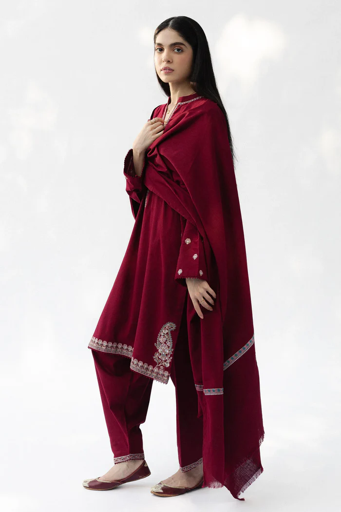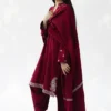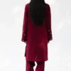 A three-piece red linen suit featuring a regular-fit kurta with subtle embroidered detailing, offering a classic and refined look.