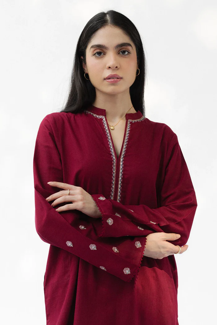 Paired with a matching linen shalwar featuring complementary embroidery, completing the outfit with a graceful and polished finish.