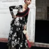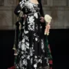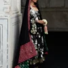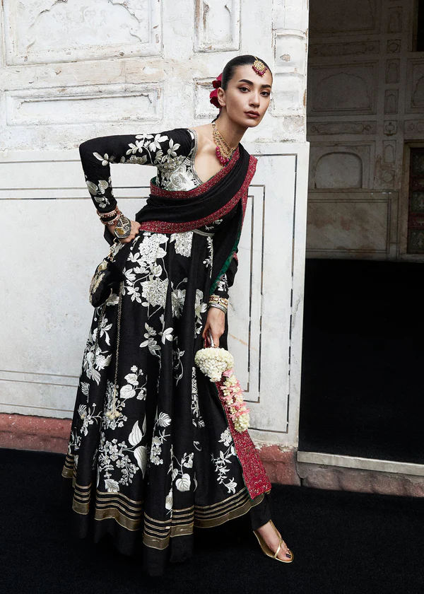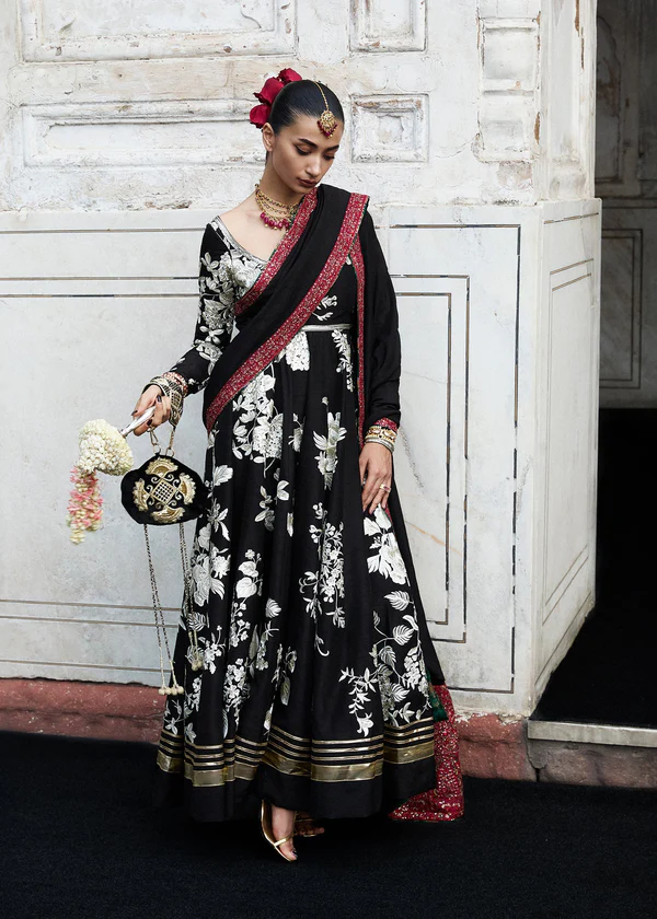 A black Korean raw silk pishwas, adorned with rich Gara embroidery, golden sequin accents, and ornate lappa and gotta detailing at the hem. Paired with a striking black Korean raw silk shawl that is color-blocked with maroon intricate embroidered borders, and finished with green printed satin silk facing. Completed with a sleek plain black Korean raw silk churidar, this ensemble exudes sophistication.