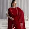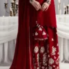 This striking red ensemble features a raw silk short shirt and shalwar, radiating timeless elegance. The shirt is beautifully embellished along the neckline and borders with intricate silver naqshi, bugle beads, sequins, and pearls, adding a luxurious sparkle. The shalwar mirrors the same exquisite embroidery, finished with a charming border that enhances the outfit’s cohesive design. Paired with a matching red chiffon dupatta edged with sleek silk finishing, this ensemble exudes both grace and sophistication. Perfect for weddings, festive occasions, and grand celebrations, it is a true statement of refined craftsmanship.
