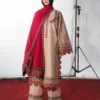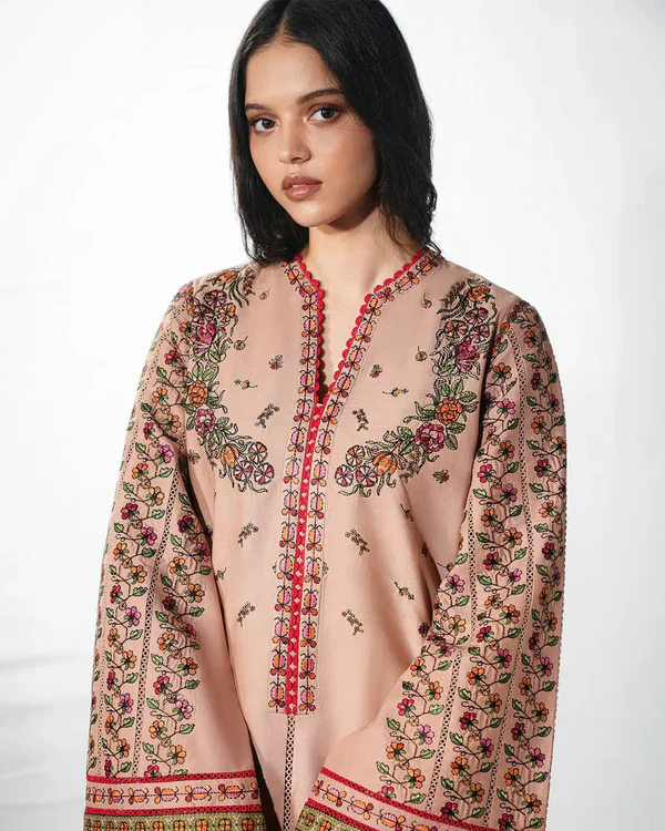 A long dusty rose shirt adorned with multicolor traditional embroidery is elegantly enhanced with organza patches on the daaman, while the bell sleeves feature matching intricate embroidery, creating a refined and graceful silhouette. The ensemble is paired with dusty rose dyed trousers finished with embroidered borders, and a multicolor traditional embroidered chiffon dupatta completes the look with a delicate, timeless finish.