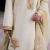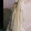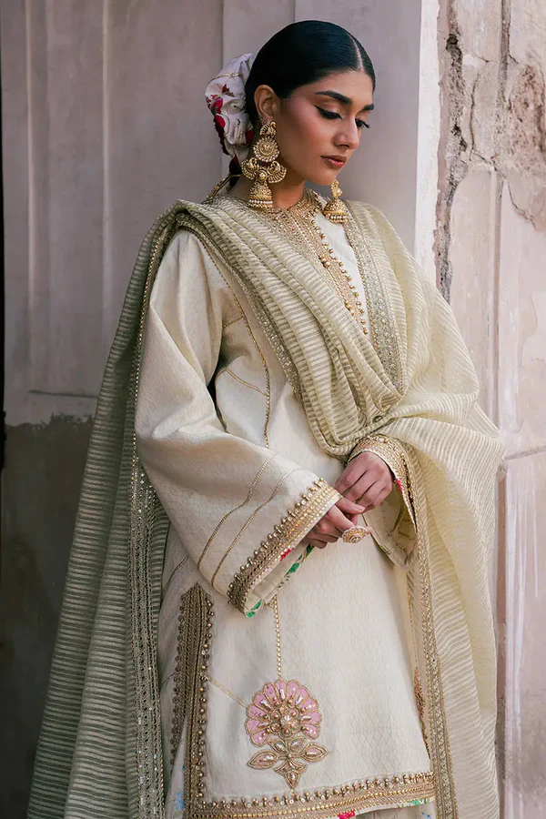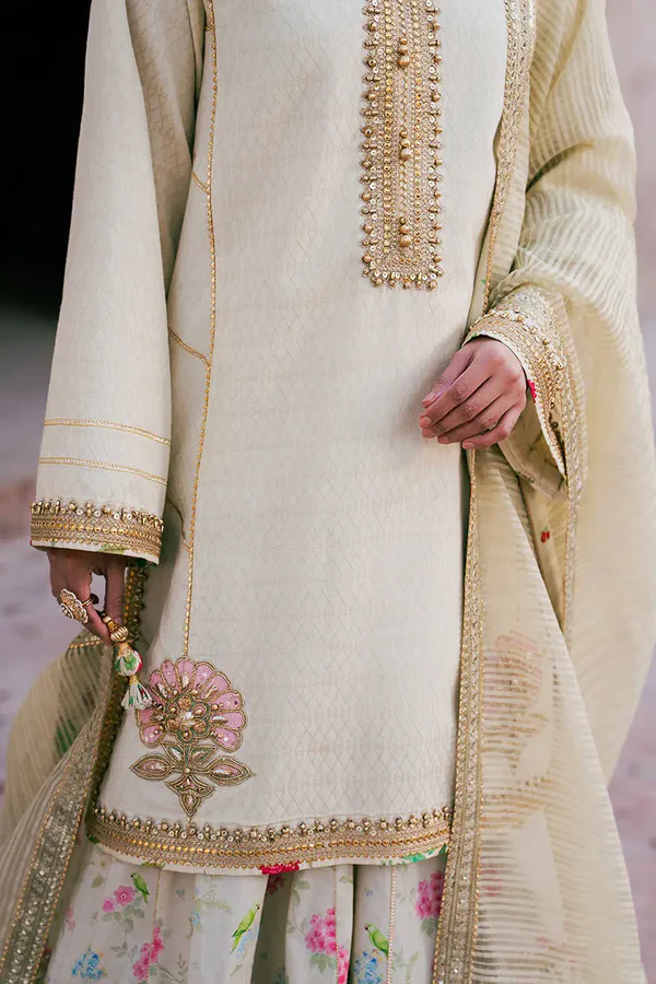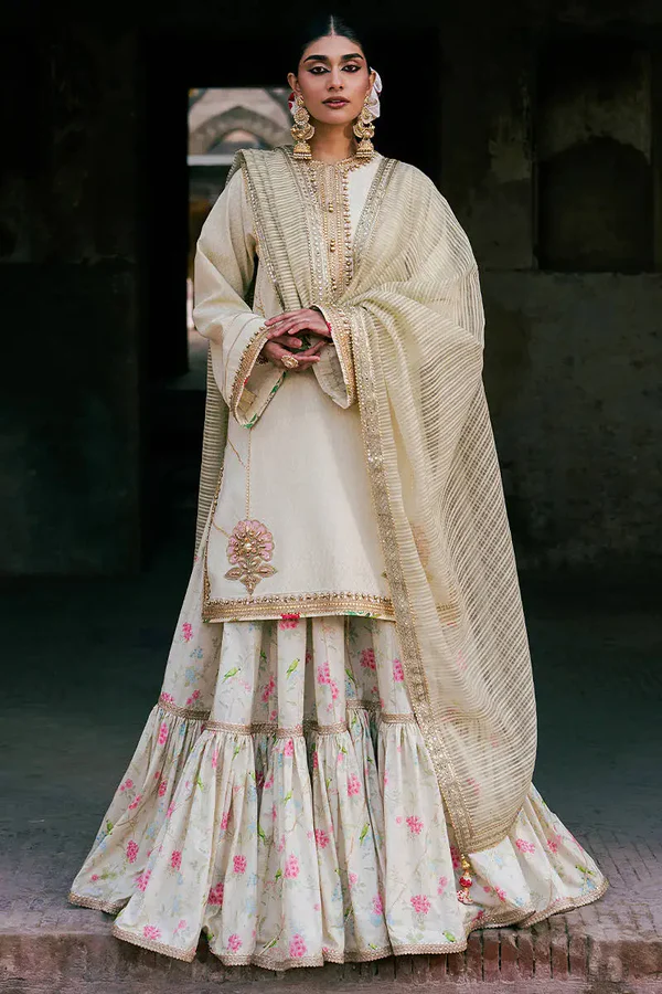 Nazm, A graceful butter yellow cambric shirt adorned with intricate border and block prints, enhanced with delicate adda work for a refined handcrafted finish. It is paired with a flowing cambric gharara, detailed with elegant trims that add movement and charm. The look is completed with a lightweight Kula Karandi organza dupatta, lending a soft, airy touch to this timeless ensemble—perfect for festive gatherings and daytime celebrations.