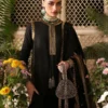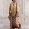 Black raw silk short shirt framed with banarsi borders on all sides and the sleeves hems. Paired with a matching Pakistani shalwar featuring banarsi borders and tissue hem accents. Completed with a raw silk and organza panelled dupatta, finished with Banarsi borders, Chanderi facings, and Kiran lace detailing on all four sides.