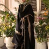 Black raw silk short shirt framed with banarsi borders on all sides and the sleeves hems. Paired with a matching Pakistani shalwar featuring banarsi borders and tissue hem accents. Completed with a raw silk and organza panelled dupatta, finished with Banarsi borders, Chanderi facings, and Kiran lace detailing on all four sides.