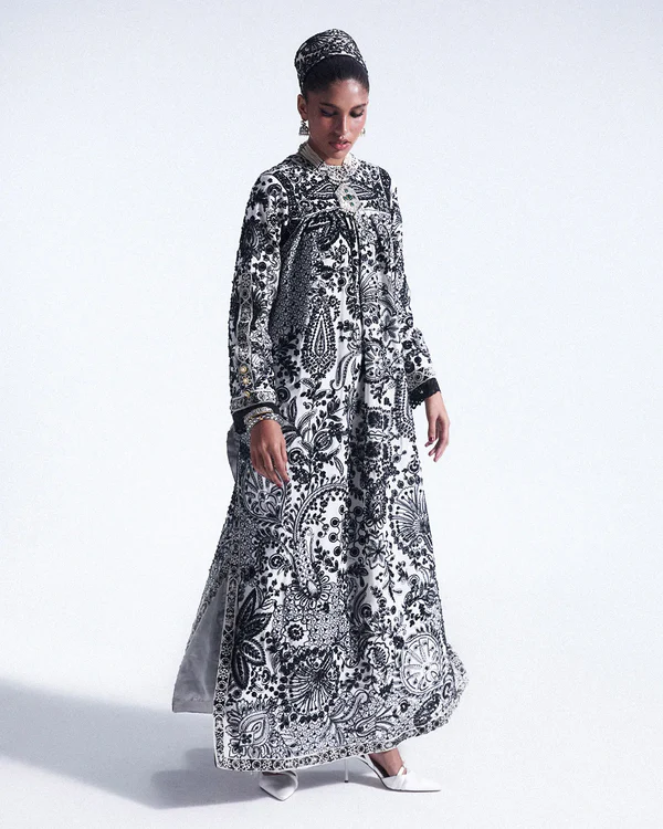 Woven in pure grip is a signature ivroy crew neck long shirt with minimal side slits. Suzani inspired black embroidery produced industrially enhanced with subtle black embellishment adds refined texture and sophistication, creating a strikingly elegant and contemporary statement piece. Paired off with sleek harem pants.