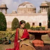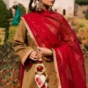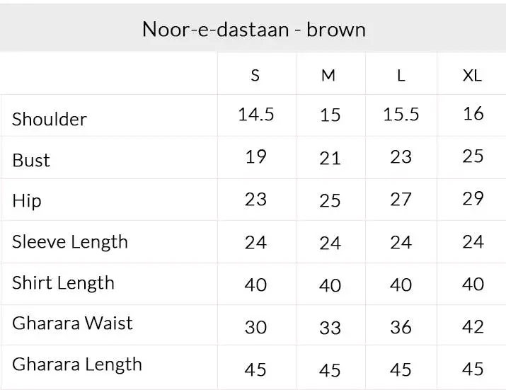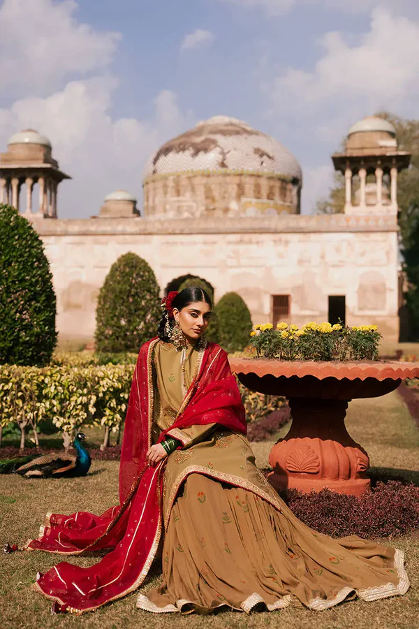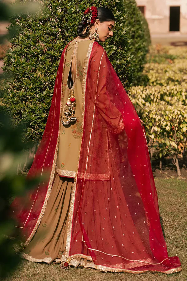 Noor-e-Dastaan, A warm brown cambric shirt, beautifully detailed with refined trims, an elegant border, and delicate adda work that adds handcrafted charm. It is paired with a flowing chiffon gharara, enhanced with matching trims for graceful movement. The look is completed with a single chaan dupatta, lending a subtle festive finish to this sophisticated and timeless ensemble.