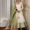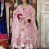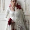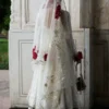 An Ivory Korean raw silk peshwaz, richly embroidered in Gara florals, ornate lappa and gotta detailing at the hem, and luminous silver sequin accents. Paired with a stunning organza dupatta, featuring bold Gara embroidery borders adorned with vibrant red rose motifs, and finished with delicate gotta trimmings. Complemented by a sleek plain Korean raw silk churidar, this ensemble exudes understated elegance.