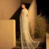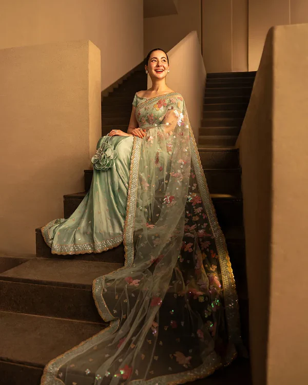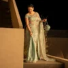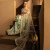 Showcasing a classic silhouette, Nureet is simply resplendent. Crafted from pastel, mint green silk, the blouse and net saree feature meticulously adorned sequin and dabka motifs that add a touch of refinement, making this piece the perfect choice for your special occasions.