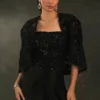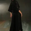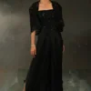 Elevate your evening style with this striking black ensemble, featuring a hand-embroidered velvet-appliqué jacket paired with a sequined and crystal-embellished bustier. The pure satin pleated skirt-pants offer graceful movement with a modern edge, creating a look that is both timeless and powerful. Effortlessly glamorous and refined, this outfit is designed to make you feel confident, polished, and unforgettable.